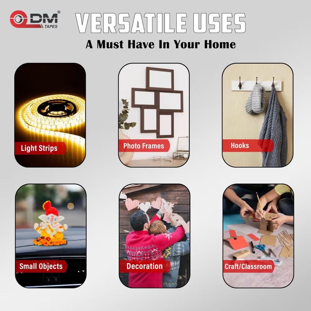 अत्यंत मजबूत पकड़ वाला 3M हेवी-ड्यूटी डबल-साइडेड जेल टेप। 1 मीटर में 6.7 किलोग्राम तक भार संभालने की क्षमता। अनइवन सतहों पर भी आसानी से काम करता है और वेदर-रेसिस्टेंट है—घर, बाहर और ऑटो इंटीरियर के लिए उपयुक्त। होम डेकोर और DIY प्रोजेक्ट्स के लिए बेहतरीन। उपलब्ध है Sagar Decorations पर।
